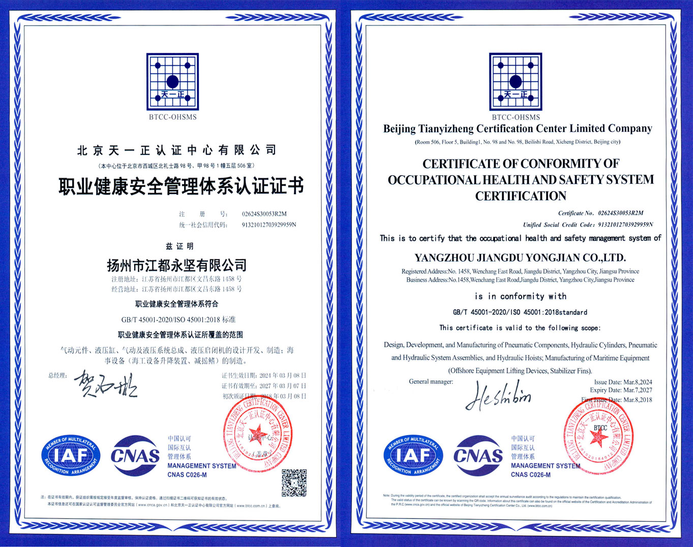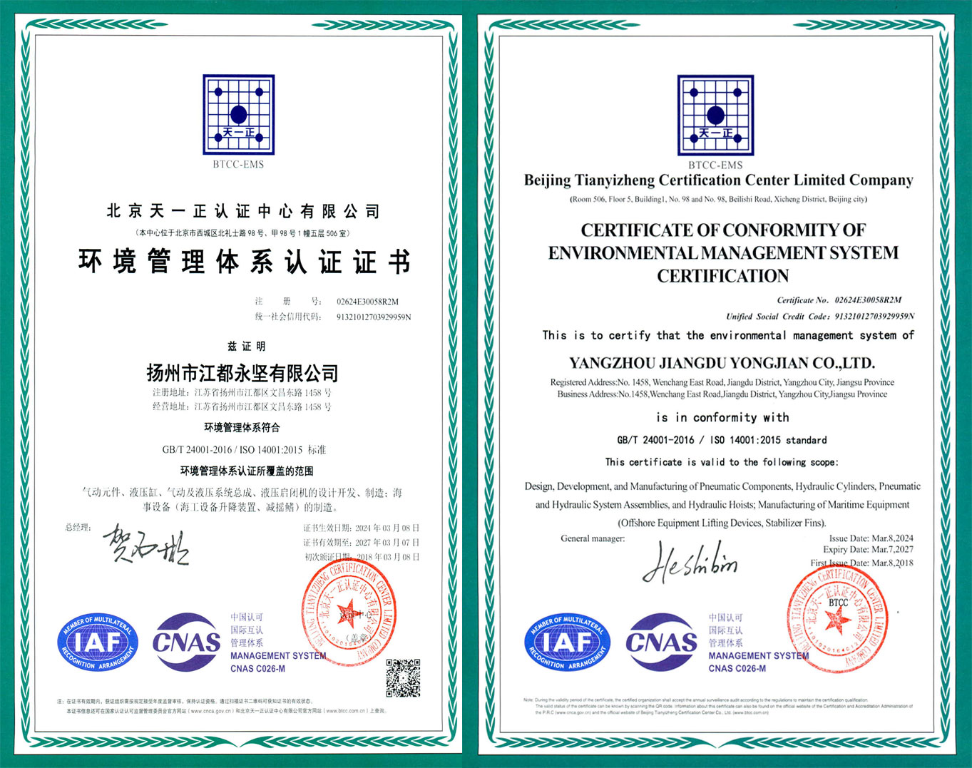 目前公司為國家液壓標(biāo)準(zhǔn)化委員會委員,近5年來主持起草國家液壓缸相關(guān)標(biāo)準(zhǔn)5個;公司為中國液氣密協(xié)會理事,1995年開始建立了ISO9001質(zhì)量管理體系,目前公司通過GJB9001C、GB/T19001—2016質(zhì)量體系認(rèn)證,通過職業(yè)健康安全及環(huán)境保護(hù)管理體系認(rèn)證;公司擁有省著名商標(biāo)、省名牌產(chǎn)品、中國水利信用AAA級、銀行信用AAA級、省質(zhì)量信用AAA級,2018年以來榮獲揚州市科技進(jìn)步一等獎2個,省科學(xué)技術(shù)三等獎2個。